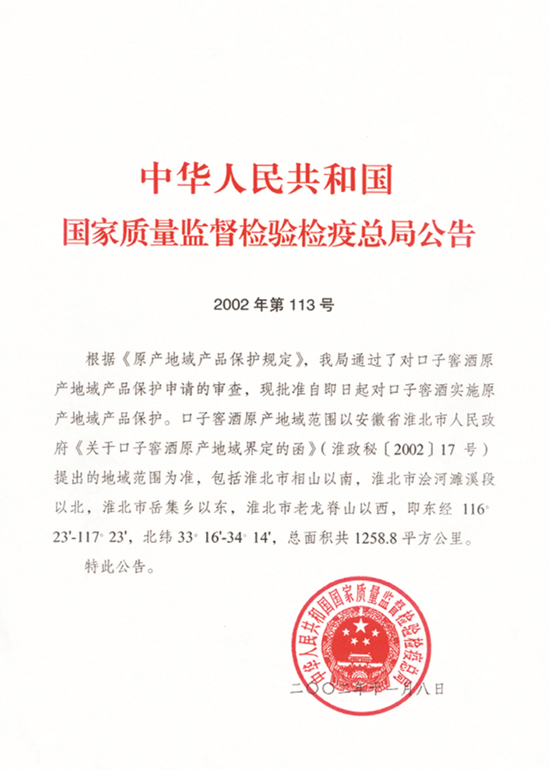 口子商標被國家商務部首批認定為中華老字號,公司董事、常務副總經理張國強被評定為首屆中國釀酒大師。